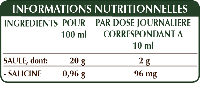 Extrait Intégral Liquide non alcoolisé obtenu à partir de : glycérine végétale bidistillée, eau pure, herbe de saule (Salix alba et purpurea) écorces.
