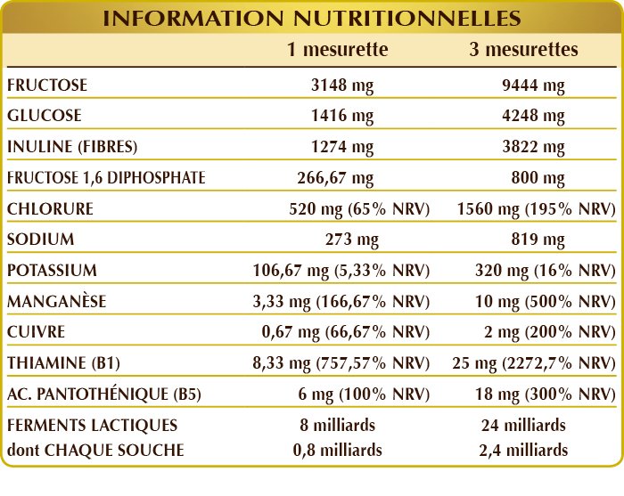 Fructose, glucose (dextrose), chicorée (Cichorium intybus) racines, extrait sec (normalisé à 90% d'inuline), chlorure de sodium (sel marin), maltodextrines de maïs ou de riz, fructose 1,6 diphosphate, chlorure de potassium, arôme caramel, mélange de ferments lactiques vivants (normalisé à 10% pour chacune de souches suivantes: Bifidobacterium bifidum SD5215, breve SD5206, lactis SD5219; Lactobacillus acidophilus SD5212, brevis SD5214, bulgaricus SD5589, casei SD5213, paracasei SD5275, plantarum SD5209, rhamnosus SD5217), gluconate de manganèse, vitamine B1 (chlorhydrate de thiamine), vitamine B5 (pantothénate de calcium), gluconate de cuivre.