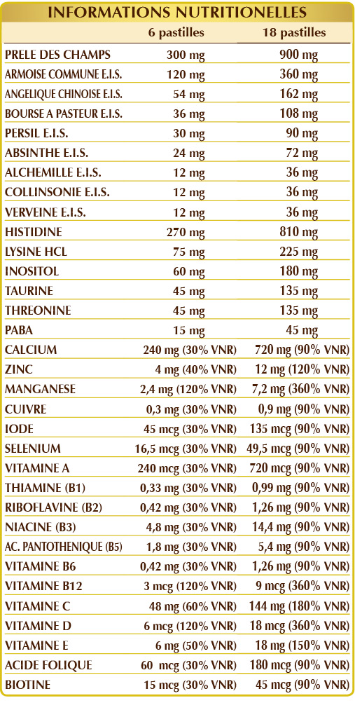 Lactate de calcium, prêle des champs ou queue de cheval (Equisetum arvense) herbe, (L-)histidine, phosphate de calcium dibasique, cellulose microcristalline°, gomme arabique°, armoise commune (Artemisia vulgaris) herbe avec des fleurs E.I.S., carbonate de calcium, (L-)lysine HCL ou chlorhydrate, inositol, angélique chinoise (Angelica Sinensis) (Angelica sinensis) racines E.I.S., vitamine C (acide ascorbique), taurine, (L-)thréonine, bourse à pasteur (Capsella bursa-pastoris) herbe E.I.S., dioxyde de silicium°°, persil (Petroselinum crispum) fruits E.I.S., gluconate de zinc, absinthe (Artemisia absinthium) herbe avec des fleurs E.I.S., herbe avec des fleurs E.I.S., PABA (acide p-aminobenzoïque), vitamine E d’origine végétale (acétate de D-α-tocophéryle), Stéarate de magnésium d’origine végétale°°, alchémille (Alchemilla vulgaris) herbe E.I.S., collinsonie (Collinsonia canadensis) racines E.I.S., verveine (Verbena officinalis) herbe avec des fleurs E.I.S., vitamine B3 (niacine), gluconate de cuivre, vitamine B5 (pantothénate de calcium), vitamine A (acétate de rétinyl), vitamine B6 (chlorhydrate de pyridoxine), vitamine B2 (riboflavine), vitamine B1 (chlorhydrate de thiamine), acide folique, Iodure de potassium, sélénite de sodium, biotine, vitamine D3 (cholécalciférol) d’origine végétale (extraite du lichen Cladonia rangiferina), vitamine B12 (cyanocobalamine).