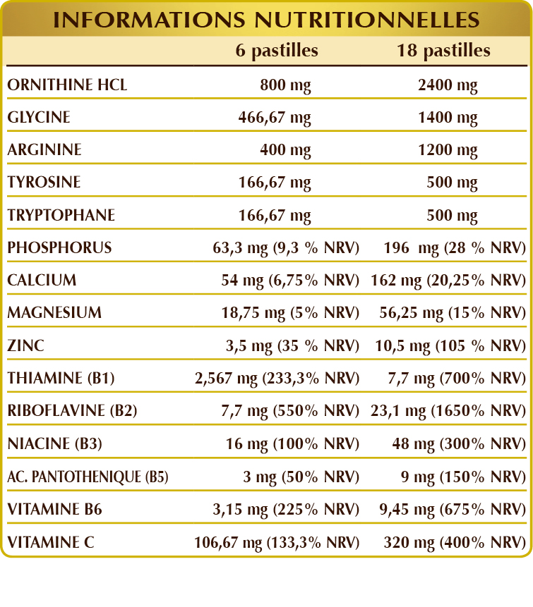 (L-)Ornithine HCl ou chlorhydrate, glycine, (L-)arginine, phosphate de calcium dibasique, (L-)tyrosine, (L-)tryptophane, glycophosphate de magnésium, dioxyde de silicium°°, cellulose microcristalline°, vitamine C (acide ascorbique), stéarate de magnésium d’origine végétale°°, gomme arabique°, gluconate de zinc, vitamine B3 (nicotinamide, inositol hexanicotinate), vitamine B2 activée (riboflavine-5-phosphate sodique), vitamine B6 activée (pyridoxal-5-phosphate), vitamine B1 (chlorhydrate de thiamine), vitamine B5 (pantothénate de calcium).