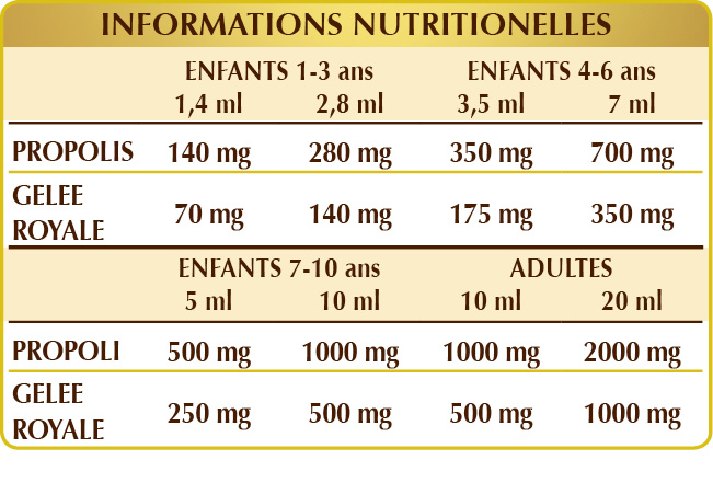 Complément de propolis et gelée royale fraîche. La propolis est une substance complexe d'origine végétale que les abeilles collectent et retransformée avec l'ajout de cire, de pollen et d'enzymes. La gelée royale, produite par les abeilles ouvrières, est une "super nourriture" très nourrissante utilisée par les abeilles pour nourrir toutes les larves jusqu'à trois jours d'âge et utilisée pour nourrir la reine des abeilles pour toute la durée de sa longue vie.