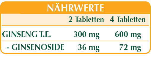Ginseng (Panax ginseng) racines et feuilles E.S. (standardisé à 12 % en ginsénosides), cellulose microcristalline°, gomme arabique°, maltodextrine de maïs ou de riz, dioxyde de silicium°°, stéréate de magnésium d'origine végétale°°.