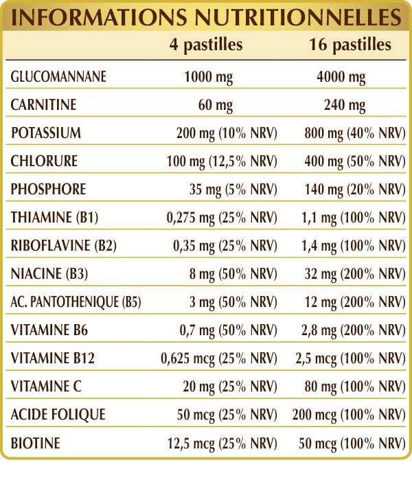Les effets bénéfiques sont obtenus avec la prise journalière de : * 3 g (en 3 doses de 1 g) / ** 4 g de glucomannane.
