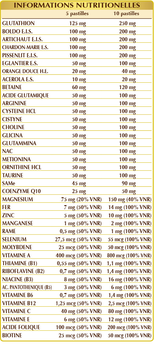 Cellulose microcristalline°, gomme arabique°, glutathion, oxyde de magnésium, tartrate de choline, boldo (Peumus boldus) feuilles E.I.S., artichaut (Cynara scolymus) feuilles E.I.S., chardon-Marie (Silybum marianum) fruits E.S. (standardisé à 80% de silymarine), pissenlit (Taraxacum officinale) racines E.I.S., dioxyde de silicium°°, SAMe (Sulfo-Adénosyl-Méthionine), gluconate de fer, bétaïne, acide (L-)glutamique, (L-)arginine, (L-)cystéine HCL ou chlorhydrate, (L-)cystine, glycine, (L-)glutamine, NAC (N-acétylcystéine), (L-)méthionine, (L-)ornithine HCL ou chlorhydrate, églantier (Rosa canina) fruits E.S. (standardisé à 70% de vitamine C), taurine, gluconate de zinc, coenzyme Q10; arôme naturel : orange douce (Citrus aurantium var. sinensis ou dulcis) écorces des fruits H.E., vitamine E d'origine naturelle (acétate de D-α-tocophéryle), stéarate de magnésium d'origine végétale°°, acérola (Malpighia glabra) fruits E.S. (standardisé à 50% de vitamine C), vitamine B3 (nicotinamide), gluconate de manganèse, gluconate de cuivre, vitamine B5 (pantothénate de calcium), vitamine A (acétate de rétinyle), vitamine B2 activée (riboflavine 5-phosphate de sodium), vitamine B6 activée (pyridoxal 5-phosphate), vitamine B1 (chlorhydrate de thiamine), acide folique activé (L-méthylfolate de calcium), molybdate de sodium, sélénite de sodium, biotine, vitamine B12 activée (5-désoxyadénosylcobalamine, méthylcobalamine). °Agent de charge °°Antiagglomerante.