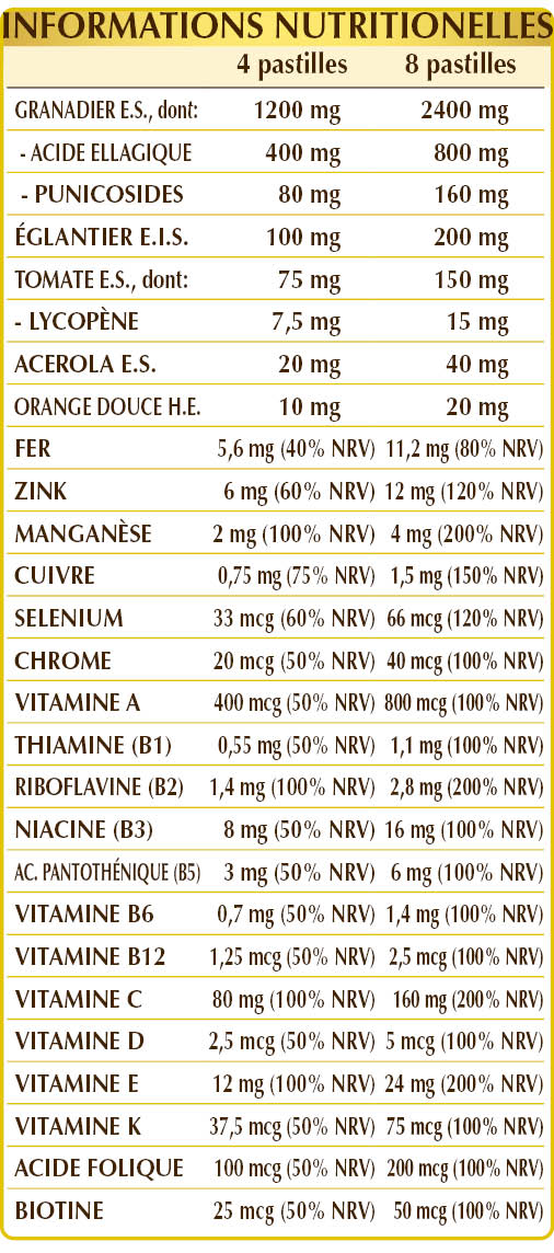 Grenadier commun (Punica Granatum) fruits E.S. (normalisé à 40% de acide ellagique), grenadier commun (Punica granatum) fruits E.S. (standardisé à 40% en acide chlorogénique), cellulose microcristalline°, gomme arabique°, gélatine alimentaire, églantier (Rosa canina) fruits E.I.S. (standardisé à 70% en vitamine C), tomate (Solanum lycopersicum) fruits E.S. (standardisé à 10% en lycopène), gluconate de fer, gluconate de zinc, dioxyde de silicium°°, vitamine E d'origine naturelle (acétate de D-α-tocophéryle), acérola E.S. (Malpighia glabra) fruits E.S. (standardisé à 50% en vitamine C), gluconate de manganèse ; arôme naturel : orange douce (Citrus aurantium var. sinensis ou dulcis) écorces des fruits H.E ; stéarate de magnésium d’origine végétale°°, vitamine B3 (nicotinamide), vitamine B5 (pantothénate de calcium), sulfate de cuivre, vitamine A (acétate de rétinyle), vitamine B2 activée (riboflavine-5-phosphate de sodium), vitamine B6 activée (pyridoxal-5-phosphate), lichen (Cladonia rangiferina) thalle E.S. (standardisé à vitamine D3 cholécalciférol 100 000 UI/g), vitamine B1 (thiamine), picolinate de chrome, acide folique activé (L-méthylfolate de calcium), sélénite de sodium, vitamine K1 (phylloquinone), biotine, vitamine B12 activée (5-désoxyadénosylcobalamine, méthylcobalamine). °Agent de charge. °°Antiagglomerante.