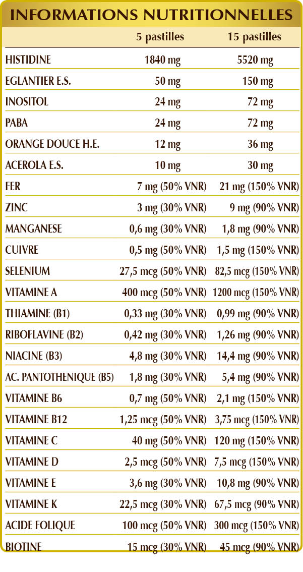 (L-)histidine, gomme arabique°, cellulose microcristalline°°, églantier (Rosa canina) fruits E.I.S. (titré à 70% de vitamine C), citrate d'ammonium ferrique, dioxyde de silicium°°, myo-inositol d'origine végétale (extrait de graines de maïs), PABA (acide p-aminobenzoïque), gluconate de zinc; arome naturel : orange douce (Citrus aurantium var. sinensis ou dulcis) écorces des fruits H.E., acérola (Malpighia glabra) fruits E.S. (titré à 50% de vitamine C), stéarate de magnésium d'origine végétale°°, vitamine E d'origine naturelle (acétate de D-α-tocophéryle), gluconate de manganèse, vitamine B3 (nicotinamide), vitamine A (acétate de rétinyle), vitamine B5 (pantothénate de calcium), sulfate de cuivre, vitamine B6 activée (phosphate de pyridoxal-5), vitamine B2 activée (phosphate de riboflavine sodique), vitamine B1 (chlorhydrate de thiamine), acide folique activé (L-méthylfolate de calcium), lichen (Cladonia rangiferina) thallus E.S. (titré en vitamine D3 cholécalciférol 100 000 UI/g), sélénite de sodium, vitamine K1 (phyloquinone), biotine, vitamine B12 activée (5'-désoxyadénosylcobalamine, méthylcobalamine). °Agent de charge. °°Antiagglomerante.