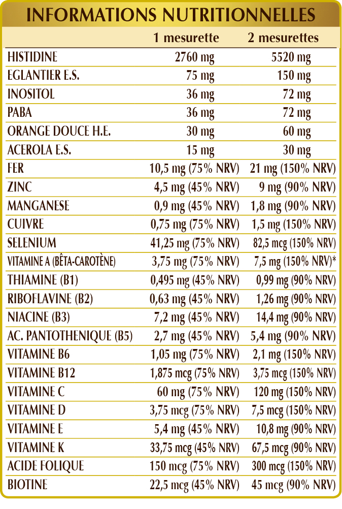 (L-)histidine, maltodextrine de maïs ou de riz, églantier (Rosa canina) fruits E.S. (normalisé à 70% de vitamine C), citrate d'ammonium ferrique, carotte (Daucus carota) racines E.S. (standardisé à 10 % en bêta-carotène), inositol d’origine végétale (extrait de graines de maïs), PABA (acide p-aminobenzoïque), gluconate de zinc ; arôme naturel : orange douce (Citrus aurantium var. sinensis ou dulcis) écorces de fruits H.E. ; acerola (Malpighia glabra) fruits extrait sec. (standardisé à 50% de vitamine C), vitamine E d'origine naturelle (acétate de D-α-tocophéryle); édulcorants d’origine naturelle : glycosides de stéviol issus de la stévia, thaumatine ; gluconate de manganèse, vitamine B3 (niacine), sulfate de cuivre, vitamine B5 (pantothénate de calcium), vitamine B6 (chlorhydrate de pyridoxine), vitamine K1 (phylloquinone), vitamine B1 (chlorhydrate de thiamine), vitamine B2 (riboflavine), acide folique, sélénite de sodium, biotine, vitamine D3 (cholécalciférol), vitamine B12 (cyanocobalamine).