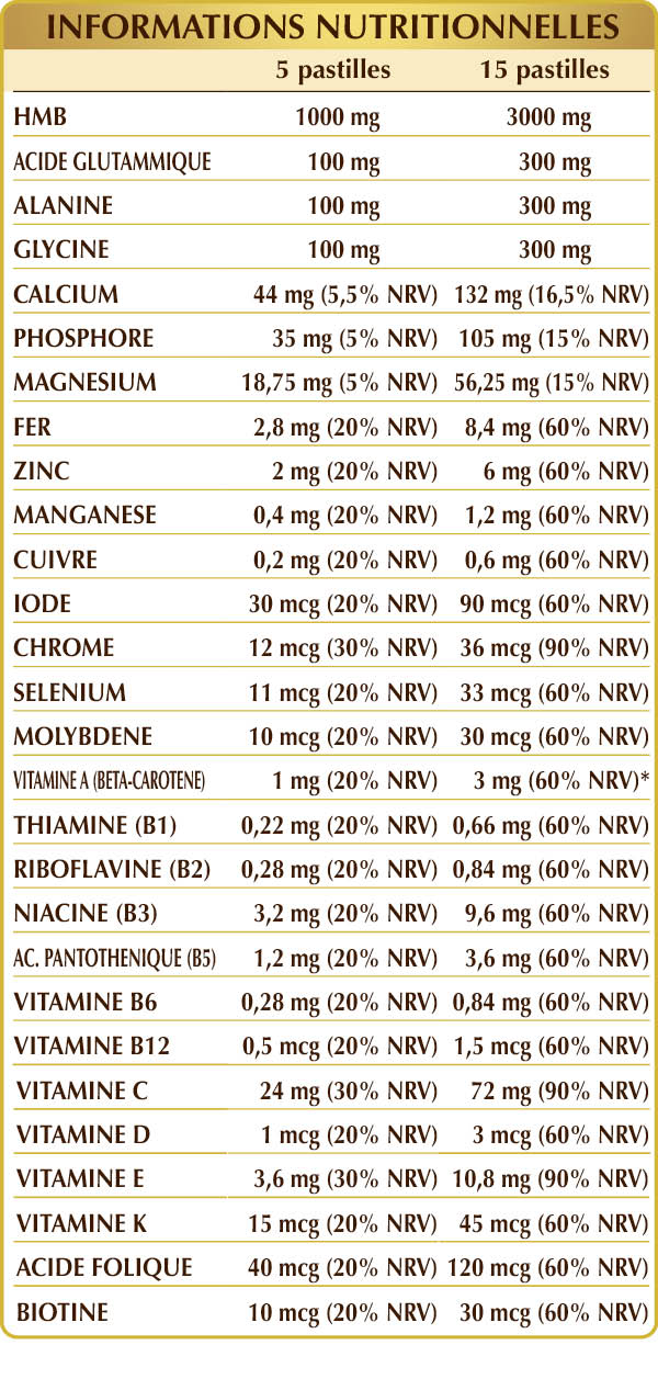 HMB (hidroximetilbutirato de calcio), celulosa microcristalina°, goma arábiga°, fosfato de calcio dicalcico, ácido (L-)glutámico, (L-)alanina, glicina, óxido de magnesio, dióxido de silicio°°, gluconato ferroso, vitamina C (ácido L-ascórbico), gluconato de zinc, estearato de magnesio de origen vegetal°°, beta-caroteno de raíces de zanahoria (estandarizado al 10%), vitamina E de origen vegetal (acetato de D-α-tocoferilo), vitamina B3 (inositol hexanicotinato), gluconato de manganeso, gluconato de cobre, vitamina B5 (pantotenato de calcio), vitamina B2 activada (riboflavina 5-fosfato de sodio), vitamina B6 activada (piridoxal-5-fosfato), liquen (Cladonia rangiferina) talo E.S. (titré en vitamine D3 cholécalciférol 100 000 UI/g), vitamine B1 (chlorhydrate de thiamine), picolinate de chrome, acide folique activé (L-méthylfolate de calcium), potassium iodure, sélénite de sodium, molibdat de sodium, vitamine K1 (phyloquinone), biotine, vitamine B12 activée (5'-désoxyadénosylcobalamine, méthylcobalamine). E.S. = Extrait Sec °Agent de charge °°Agent antiagglomérant