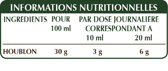Extrait Intégral Liquide non alcoolisé obtenu à partir de : glycérine végétale bidistillée, eau pure, cônes (fleurs femelles) de houblon (Humulus lupulus).
