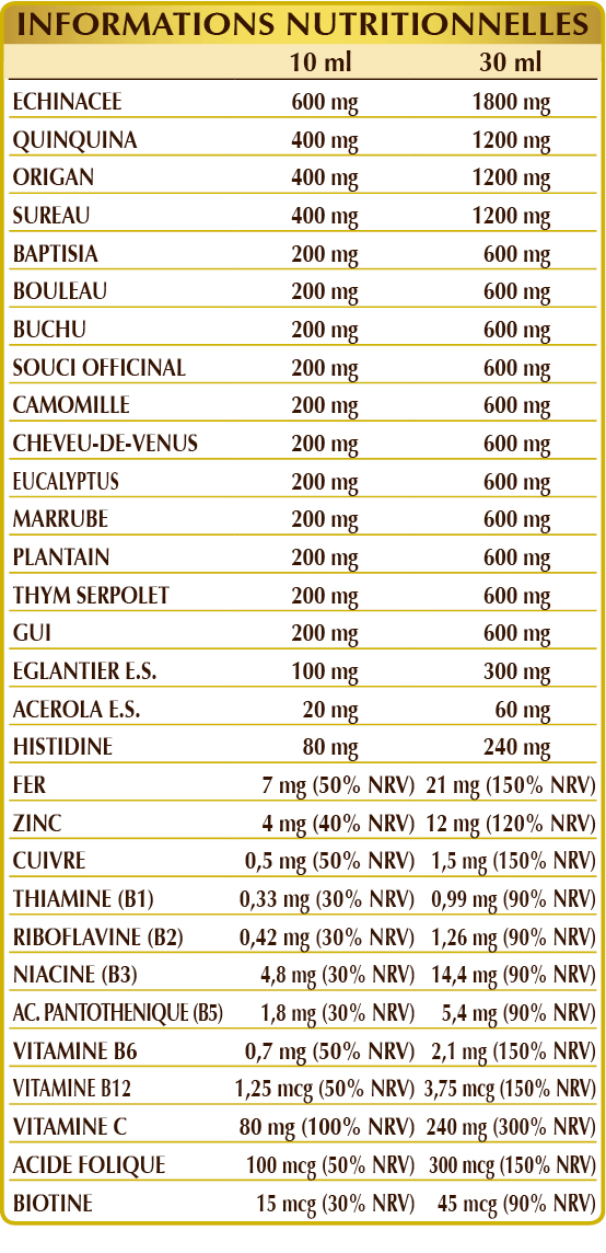 Glycérine végétale bidistillée, eau pure, racines d'échinacée (Echinacea angustifolia, purpurea et pallida) E.I.L., écorces de quinquina (Cinchona calisaya) E.I.L., feuilles d'origan (Origanum vulgare) E.I.L., fleurs de sureau (Sambucus nigra) E.I.L., racines de baptisia (Baptisia tinctoria) E.I.L., bouleau blanc (Betula alba or pubescens) feuilles E.I.L., buchu (Barosma betulina) feuilles E.I.L., calendula (Calendula officinalis) têtes des fleurs E.I.L., camomille commune (Matricaria chamomilla) têtes des fleurs E.I.L., cheveu-de-Vénus (Adiantum capillus-veneris) herbe E.I.L., eucalyptus (Eucalyptus globulus) feuilles E.I.L., fraisier (Marrubium vulgare) herbe avec des fleurs E.I.L., plantain (Plantago lanceolata) feuilles E.I.L., thym (Thymus serpyllum) feuilles E.I.L., gui (Viscum album) feuilles et rameaux E.I.L., églantier (Rosa canina) fruits E.I.L. (standardisé à 70% en vitamine C), (L)histidine, gluconate de fer, gluconate de zinc, acérola (Malpighia glabra) fruits E.S. (standardisé à 50% en vitamine C); édulcorants d'origine naturelle: glycosides de stéviol de la stévia, thaumatine ; vitamine B3 (nicotinamide), sulfate de cuivre, vitamine B5 (pantothénate de calcium), vitamine B6 activée (pyridoxal-5-phosphate), vitamine B1 (chlorhydrate de thiamine), vitamine B2 activée (riboflavine 5-phosphate de sodium), acide folique activé (calcium L-méthylfolate), biotine, vitamine B12 activée (5-désoxyadénosylcobalamine, méthicobalamine).