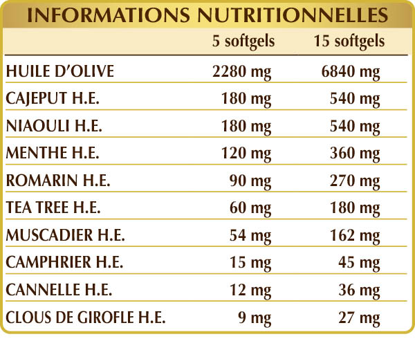 Huile d'olive extra-vierge des olives dénoyautées, cajeput (Melaleuca leucadendron var. cajaputi) feuilles H.E., niaouli (Melaleuca leucadendron var. viridiflora) feuilles H.E., menthe poivrée (Mentha piperita) feuilles H.E., romarin (Rosmarinus officinalis) feuilles H.E., tea tree (Melaleuca alternifolia) sommités H.E., muscadier (Myristica fragrans) graines H.E., camphrier (Cinnamomum camphora) écorces H.E., cannelle (Cinnamomum zeylanicum) écorces H.E., clous de girofle (Eugenia caryophyllata) bourgeons floraux H.E. ; excipients (softgel): gélatine alimentaire et glycérine.