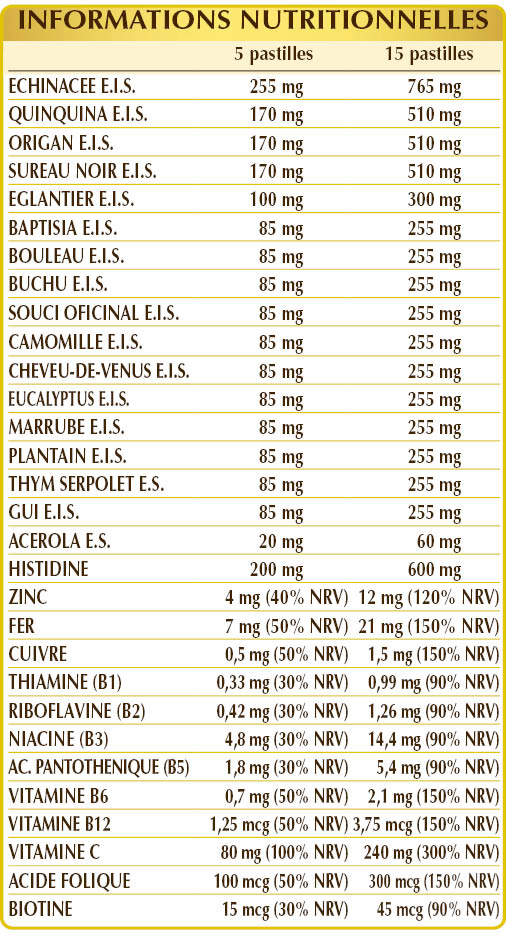 Échinacée (Echinacea angustifolia, purpurea et pallida) racines E.I.S., (L-)histidine, cellulose microcristalline°, gomme arabique°, quinquina (Cinchona calysaya) écorces E.I.S., origan (Origanum vulgare) feuilles E.I.S., sureau noir (Sambucus nigra) fleurs E.I.S., églantier (Rosa canina) fruits E.I.S. (titré à 70% en vitamine C), baptisia (Baptisia tinctoria) racines E.I.S., bouleau blanc (Betula alba ou pubescens) feuilles E.I.S., buchu (Barosma betulina) feuilles E.I.S., calendula (Calendula officinalis) têtes des fleurs E.I.S., camomille matricaire (Matricaria chamomilla) têtes des fleurs E.I.S., cheveu-de-Vénus herbe (Adiantum capillus-veneris) herbe E.I.S., eucalyptus (Eucalyptus globulus) feuilles E.I.S., marrube blanc (Marrubium vulgare) herbe avec des fleurs E.I.S., plantain (Plantago lanceolata) feuilles E.I.S., thym serpolet (Thymus serpyllum) feuilles E.I.S., gui (Viscum album) feuilles et rameaux E.I.S., dioxyde de silicium°°, gluconate de fer, gluconate de zinc, stéarate de magnésium d'origine végétale°°, acérola (Malpighia glabra) fruit D.E. (titré à 50% de vitamine C), vitamine B3 (nicotinamide), vitamine B5 (pantothénate de calcium), sulfate de cuivre, vitamine B6 activée (pyridoxal-5-phosphate), vitamine B2 activée (riboflavine 5-phosphate de sodium), vitamine B1 (chlorhydrate de thiamine), acide folique activé (L-méthylfolate de calcium), biotine, vitamine B12 activée (5-désoxyadénosylcobalamine, méthylcobalamine). °Agent de charge. °°Antiagglomerante.