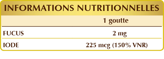 Glycérine végétale bi-distillée, eau pure, chêne marin (Fucus vesiculosus) thalle (algue) E.I.L., fructose, iodure de potassium.
