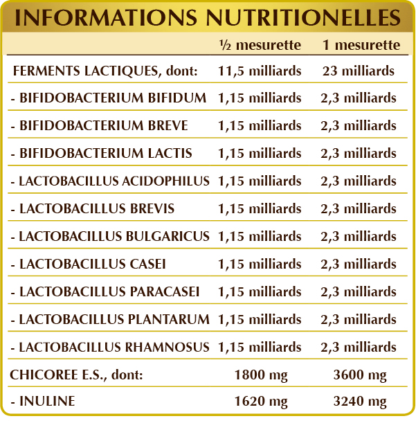 Chicorée (Cichorium Intybus) racines E.S. (standardisé à 90% d'inuline), maltodextrine de maïs ou de riz, mélange de ferments lactiques (normalisé à 10% pour chacune des souches suivantes: Bifidobacterium bifidum SD5215, breve SD5206, lactis SD5219; Lactobacillus acidophilus SD5212, brevis SD5214, bulgaricus SD5589, casei SD5213, paracasei SD5275, plantarum SD5209, rhamnosus SD5217).