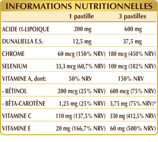 Complément alimentaire à base d'acide lipoïque, sels minéraux et vitamines. Les vitamines C, E et le sélénium contribuent à la protection des cellules contre le stress oxydatif. La vitamine A intervient dans le processus de spécialisation des cellules et, avec la Dunaliella, favorise le maintien de la capacité visuelle. Le chrome, enfin, favorise le maintien des niveaux normaux de glucose dans le sang.