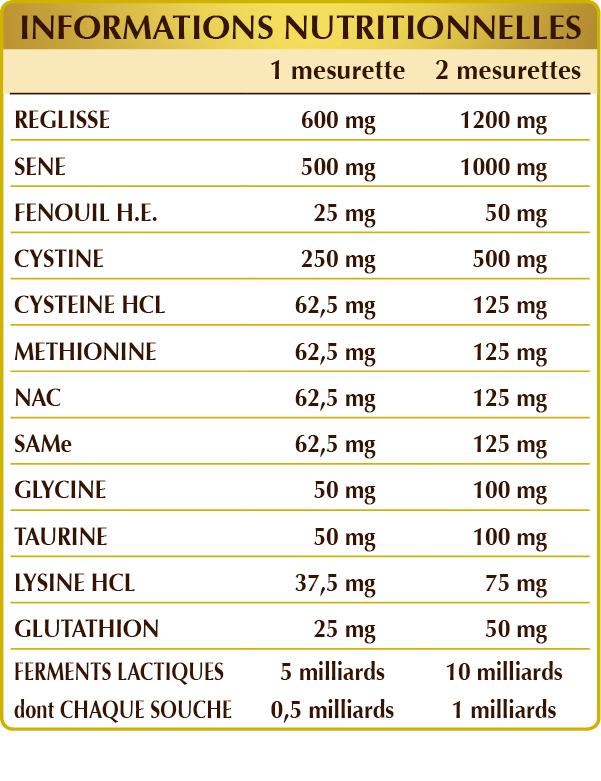 Fructose, racines de réglisse (Glycyrrhiza glabra), feuilles de séné (Cassia angustifolia), (L-)cystine, (L-)cystéine HCL ou chlorhydrate, (L-)méthionine, NAC (N-acétylcystéine), SAMe (S-adénosil méthionine), glycine, taurine, (L-)lysine, graines de fenouil (Foeniculum vulgare) H.E, glutathion, mélange de ferments lactiques (titré à 10% dans chacune des souches ATCC suivantes: Bifidobacterium bifidum SD5215, Bifidobacterium breve SD5206, Bifidobacterium lactis SD5219; Lactobacillus acidophilus SD5212, Lactobacillus brevis SD5214, Lactobacillus bulgaricus SD5589, Lactobacillus casei SD5213, Lactobacillus paracasei SD5275, Lactobacillus plantarum SD5209, Lactobacillus rhamnosus SD5217).