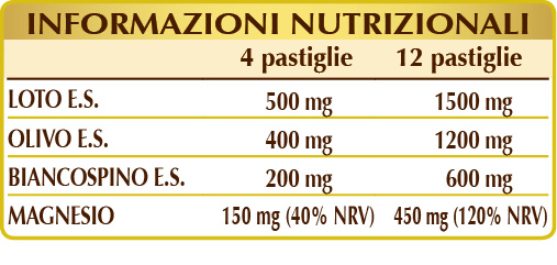 Lotus sacré (Nelumbo nucifera) graines E.S. (normalisé à 0,6 % de liensinine), olivier (Olea europaea) feuilles E.S. (normalisé à 40% d'oleuropéine), cellulose microcristalline°, gomme arabique°, oxyde de magnésium, aubépine (Crataegus oxyacantha) fleurs et feuilles E.S. (titré à 40% en antocyanosides), dioxyde de silicium°°, stéarate de magnésium d'origine végétale°°.