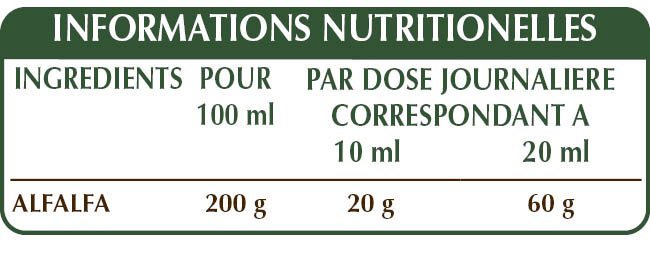 Extrait Intégral Liquide non alcoolisé obtenu à partir de : glycérine végétale bidistillée, eau pure, herbe avec des fleurs de alfalfa ou luzerne (Medicago sativa) .