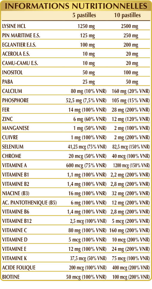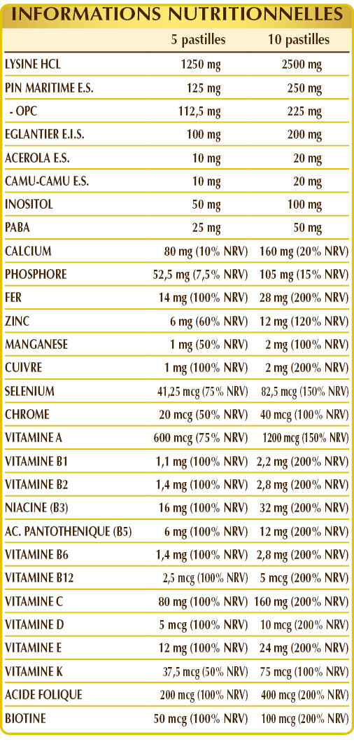(L-)lysine HCL ou chlorhydrate, phosphate de calcium dibasique, pin sylvestre (Pinus sylvestris) écorces E.S. (standardisé à 90% de proanthocyanidine oligomérique ou OPC), gélatine alimentaire, cellulose microcristalline°, gomme arabique°, églantier (Rosa canina) fruits E.I.S. standardisé à 70% de vitamine C), citrate d'ammonium ferrique, myo-inositol d’origine végétale (extrait de graines de maïs), dioxyde de silicium°°, gluconate de zinc, carbonate de calcium, vitamine E d'origine végétale (acétate de D-α-tocophéryle), PABA (acide p-aminobenzoïque), vitamine B3 (nicotinamide), stéarate de magnésium d'origine végétale°°, fruits d'acérola (Malpighia glabra) E.S. (titré à 50 % de vitamine C), camu-camu (Myrciaria dubia) fruits E.S. (titré à 50% de vitamine C), vitamine b12 activée (5-désoxyadénosylcobalamine, méthylcobalamine), agent de charge, lichen (Cladonia rangiferina) thalle E.S. (standardisé en vitamine D3 cholécalciférol 100 000 UI/g), vitamine b1 (chlorhydrate de thiamine), acide folique activé (L-méthylfolate de calcium), picolinate de chrome, séléniite de sodium, biotine, vitamine k1 (phylloquinone), vitamine b12 activée (5-désoxyadénosylcobalamine, méthylcobalamine).°Agent de charge. °°Agent antiagglomérant.