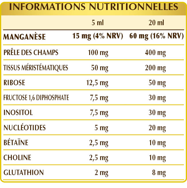 Glycérine végétale distillée, eau pure, citrate de magnésium; fraîches tissus méristématiques : aubépine (Crataegus oxyacantha, ou monogyna Crataegus) jeunes pousses, framboise (Rubus idaeus) jeunes pousses, cornouiller sanguin (Cornus sanguinea) bourgeons, prunellier (Prunus spinosa) bourgeons; gluconate de magnésium, pidolate de magnésium, ribose, Fructose 1,6 diphosphate, inositol, citrate de bétaine, tartrate de choline; mélange de nucléotides: AMP (adénosine monophosphate), CMP (cytidine monophosphate), GMP (guanosine monophosphate), UMP (uridine monophosphate); glutathion réduit ; édulcorant d'origine naturelle: thaumatine (E957). Édulcoré uniquement avec des édulcorants d'origine naturelle.