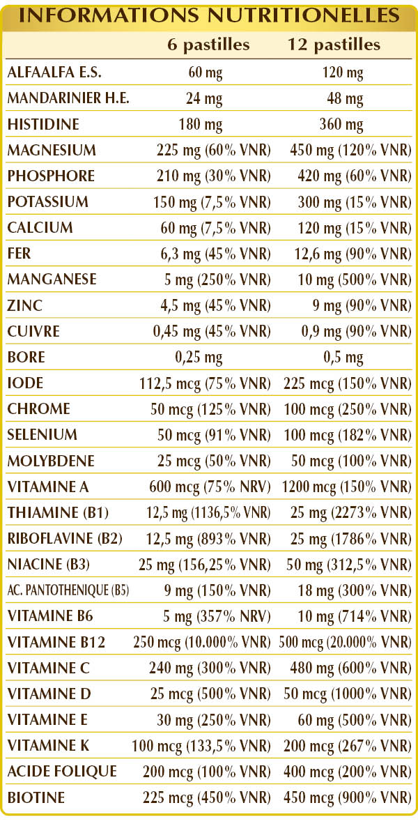 Magnésium glycérophosphate, phosphate dibasique de potassium, phosphate dibasique de calcium, cellulose microcristalline°, vitamine C (acide ascorbique), oxyde de magnésium, gomme arabique°, (L-)histidine, citrate de magnésium dibasique, vitamine E d'origine végétale (acétate de D-α-tocophérol), luzerne ou alfalfa (Medicago sativa) herbe avec fleurs E.S., dioxyde de silicium°°, gluconate de fer, gluconate de manganèse, gluconate de zinc, vitamine B3 (nicotinamide), mandarine (Citrus reticulata) écorces de fruits H.E., stéarate de magnésium d'origine naturelle°°, vitamine B1 (chlorhydrate de thiamine), vitamine B2 activée (riboflavine 5-phosphate de sodium), vitamine B5 (pantothénate de calcium), lichen (Cladonia rangiferinaa) thalle E.S. (standardisé à vitamine D3 cholécalciférol 100 000 UI/g), vitamine B6 activée (pyridoxal-5-phosphate), borate de sodium, vitamine A (acétate de rétinyle), sulfate de cuivre, picolinate de chrome, vitamine B12 activée (5-désoxyadénosylcobalamine, méthylcobalamine), biotine, acide folique activé (L-méthylfolate de calcium), iodure de potassium, sélénite de sodium, vitamine K1 (phylloquinone), molybdate de sodium. °Agent de charge. °°Antiagglomerante.