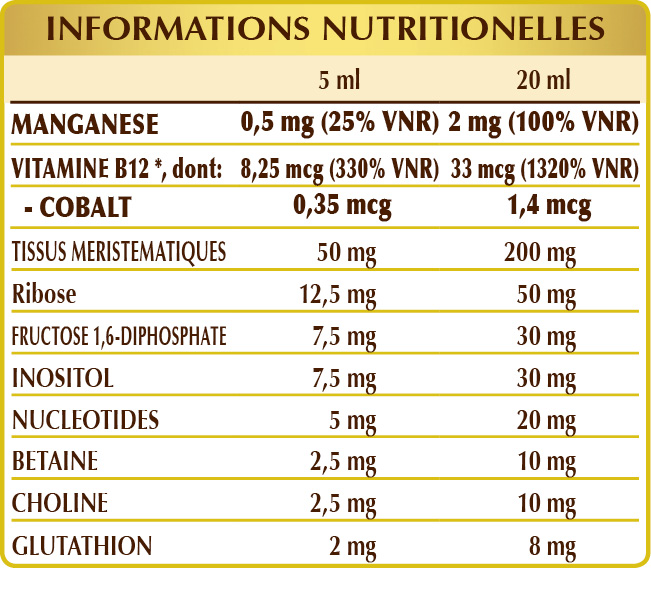 Glycérine végétale distillée, eau pure; tissus méristématiques frais : châtaignier (Castanea vesca ou Castanea sativa) bourgeons, marronnier (Aesculus hippocastanum) bourgeons, peuplier noir (Populus nigra) bourgeons, saule blanc (Salix alba) bourgeons; ribose, fructose 1,6 diphosphate; correcteur d'acidité: acide citrique; inositol, citrate de bétaïne, tartrate de choline; mélange de nucléotides: AMP (adénosine monophosphate), CMP (cytosine monophosphate), GMP (guanosine monophosphate), UMP (uridine monophosphate); gluconate de manganèse, glutathion réduit; édulcorant d'origine naturelle : la thaumatine; vitamine B12 activée (5-désoxyadénosylcobalamine, méthylcobalamine). Édulcoré uniquement avec des édulcorants d'origine naturelle.