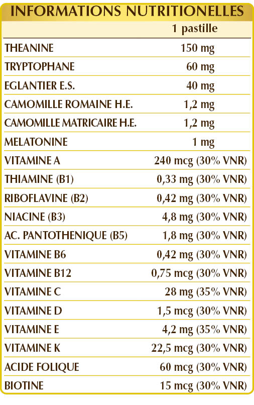 (L-)théanine, cellulose microcristalline°, (L-)tryptophane, gomme arabique°, églantier (Rosa canina) fruits E.S. (titré à 70% de vitamine C), vitamine E d'origine végétale (acétate de D-α-tocophérol), vitamine B3 (nicotinamide), dioxyde de silicium°°, stéarate de magnésium d'origine végétale°°, vitamine B5 (pantothénate de calcium), vitamine A (acétate de rétinyle), camomille romaine (Anthemis nobilis) capitules (fleurs) H.E., camomille matricaire (Matricaria chamomilla) capitules (fleurs) H.E., mélatonine, vitamine B2 activée (riboflavine 5-phosphate de sodium), vitamine B6 activée (pyridoxal-5-phosphate), lichen (Cladonia rangiferina) thalle E.S. (titré en vitamine D3 cholécalciférol 100 000 UI/g), vitamine B1 (chlorhydrate de thiamine), acide folique activé (L-méthylfolate de calcium), vitamine K1 (phyloquinone), biotine, vitamine B12 activée (5'-désoxyadénosylcobalamine, méthylcobalamine).