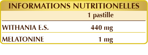 Withania ou ginseng indien (Withania somnifera) racines E.S. (normalisé à 2,5% de withanolides), cellulose microcristalline°, gomme arabique°, dioxyde de silicium°°, stéarate de magnésium d'origine végétale°°, mélatonine.