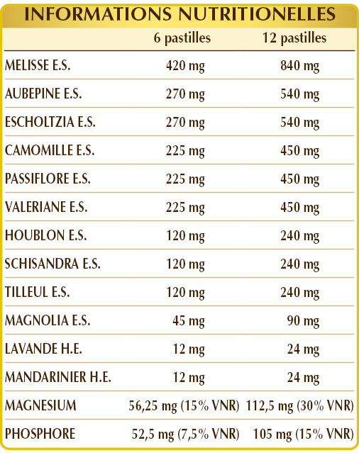 Mélisse (Melissa Officinalis) feuilles E.S. (titré à 2% d’acide rosmarinique), glycérophosphate de magnésium, cellulose microcristalline°, aubépine (Crataegus oxyacantha) fleurs et feuilles E.S. (titré à 1% de flavonoïdes), escholtzia (Eschscholzia californica) herbe E.S. (normalisé à 0,3% de protopine), camomille matricaire (Matricaria chamomilla) têtes des fleurs (fleurs) E.S. (titré à 0,2% d'apigéniné), passiflore (Passiflora incarnata) herbe avec des fleurs E.S. (titré à 2,5% de vitexine), valériane (Valeriana officinalis) racine E.S. (titré à 0,8% d'acide valérianique), dioxyde de silicium°°, houblon (Humulus lupulus) cônes (fleurs femelles) E.S. (titré à 0,4% de rutine), schisandra (Schisandra chinensis) fruits E.S. (titré à 5% de schizandrine), tilleul (Tilia platyphyllos) fleurs E.S. (titré à 1% de flavonoïde), gomme arabique°, magnolia (Magnolia officinalis) écorces E.S. (titré à 90% de magnolol et honokiol), oxyde de magnésium, stéarate de magnésium d’origine végétale°°, lavande (Lavandula latifolia) sommités fleuries H.E., mandarinier (Citrus reticulata) écorces des fruits H.E.