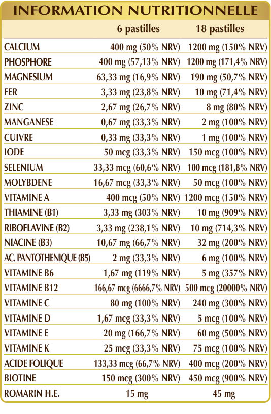 Phosphate dicalcique, glycérophosphate de magnésium, cellulose microcristalline°, gomme arabique°, stéarate de magnésium d'origine végétale°°, vitamine C (acide ascorbique), dioxyde de silicium°°, vitamine E d'origine végétale (acétate de D-α-tocophérol), gluconate de fer, gluconate de zinc, romarin (Rosmarinus officinalis) sommités fleuries H.E., vitamine B3 (hexanicotinate d'inositol, nicotinamide), gluconate de manganèse, vitamine B2 activée (riboflavine 5-phosphate de sodium), vitamine B1 (chlorhydrate de thiamine), vitamine A (acétate de rétinyle), vitamine B6 activée (pyridoxal-5 -phosphate), gluconate de cuivre, vitamine B5 (pantothénate de calcium), lichen (Cladonia rangiferina) thalle E.S. (titré en vitamine D3 cholécalcophérol 100 000 UI/g), vitamine B12 activée (5-désoxyadénosylcobalamine, méthicobalamine), acide folique activé (L-méthylfolate de calcium), sélénite de sodium, iodure de potassium, molybdate de sodium, biotine, vitamine K1 (phylloquinone). °Agent de charge °°Agent anti-agglomérant