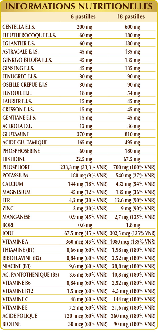 Phosphate de calcium dibasique, phosphate de potassium dibasique, glycérophosphate de magnésium, (L-)glutamine, glycérophosphate de calcium, cellulose microcristalline°, gomme arabique°, centella asiatique (Centella asiatica) herbe E.I.S., acide (L-)glutamique, dioxyde de silicium°°, eleuthérocoque ou ginseng de Sibérie (Eleutherococcus senticosus) racines E.I.S., (DL-)phosphosérine, églantier (Rosa canina) fruits E.S. (titré à 70% de vitamine C), astragale (Astragalus membranaceus) racines E.I.S., ginkgo biloba (Ginkgo biloba) feuilles E.I.S., ginseng (Panax ginseng) racines E.I.S., fenugrec (Trigonella foenum-graecum) graines E.I.S., oseille crépue (Rumex crispus) racines E.I.S., citrate d'ammonium ferrique, (L-)histidine, gluconate de zinc, oxyde de magnésium, fenouil (Foeniculum vulgare) fruits H.E., vitamine E d'origine naturelle (acétate de D-α-tocophéryle), laurier (Laurus nobilis) feuilles E.I.S., cresson de fontaine (Nasturtium officinale) herbe E.I.S., gentiane jaune (Genziana lutea) racines E.I.S., stéarate de magnésium d’origine végétale°°, acérola (Malpighia glabra) fruits E.S. (titré à 50% de vitamine C), vitamine B3 (nicotinamide), gluconate de manganèse, borate de sodium, vitamine B5 (pantothénate de calcium), vitamine A (acétate de rétinyle), vitamine B2 activée (riboflavine 5-phosphate de sodium), vitamine B6 activée (pyridoxal-5-phosphate), vitamine B1 (chlorhydrate de thiamine), acide folique activé (L-méthylfolate de calcium), iodure de potassium, biotine, vitamine B12 activée (5-désoxyadénosylcobalamine, méthylcobalamine). °Agent de charge. °°Agent anti-agglomérant.