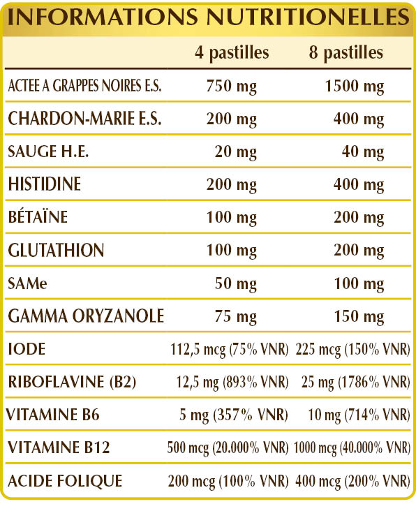 Actéé à grappes noires (Cimicifuga racemosa) rhizomes E.S. (titré à 2,5% en glycosides triterpéniques), cellulose microcristalline°, chardo-Marie (Silybum marianum) graines E.S. (titres à 80 % en silymarine), (L-)histidine, bétaïne, glutathion réduit, SAMe (S-adénosylméthionine disulfate tosylate), gomme arabique°, phosphate de calcium dibasique°, gamma oryzanol, vitamine B2 activée (riboflavine 5-phosphate de sodium), sauge (Salvia officinalis) feuilles H.E., dioxyde de silicium°°, stéarate de magnésium d'origine végétale°°, vitamine B6 activée (pyridoxal-5-phosphate), vitamine B12 activée (5-désoxyadénosylcobalamine, méthylcobalamine), acide folique activé (L-méthylfolate de calcium), iodure de potassium. °Agent de charge. °°Antiagglomerante.