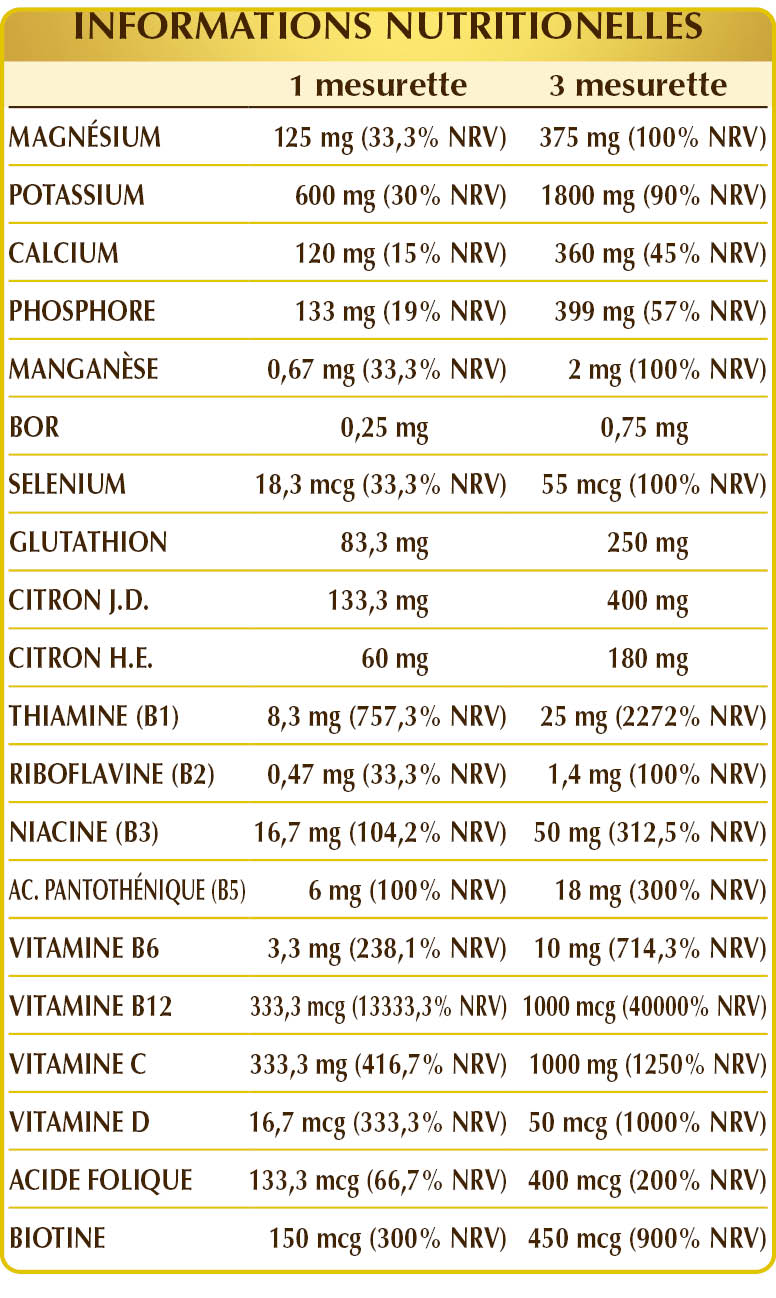 Maltodextrines de maïs et de riz, citrate de potassium, citrate de magnésium dibasique, glycérophosphate de calcium, glycérophosphate de magnésium, vitamine C (acide ascorbique), gluconate de magnésium, pidolate de magnésium, gluconate de potassium, citron (Citrus limon) zestes de fruits S.D., glutathion réduit ; arôme naturel : citron (Citrus limon) fruits O.E. ; vitamine B3 (nicotinamide), vitamine B1 (chlorhydrate de thiamine), vitamine B5 (pantothénate de calcium), lichen (Cladonia rangiferina) thalle E.S. (standardisé en vitamine D3 cholécalciférol 100 000 UI/g), gluconate de manganèse, vitamine B6 activée (phosphate de pyridoxal-5), édulcorants d’origine naturelle : glycosides de stéviol de stévia, thaumatine ; borate de sodium, vitamine B2 activée (phosphate de riboflavine-5 sodium), vitamine B12 activée (5-désoxyadénosylcobalamine et méthylcobalamine), biotine, acide folique activé (L-méthylfolate de calcium), sélénite de sodium. E.S. = Extrait Sec