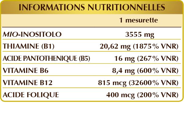 Myo-inositol d'origine végétale (extrait de graines de maïs), maltodextrine de maïs ou de riz, vitamine B1 (chlorhydrate de thiamine), vitamine B5 (pantothénate de calcium), vitamine B6 activée (pyridoxal-5-phosphate), vitamine B12 activée (5-désoxyadénosylcobalamine, méthylcobalamine), acide folique activé (L-méthylfolate de calcium).