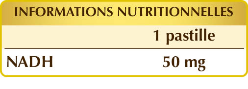Supplément de NADH, une coenzyme naturellement synthétisée par l'organisme qui participe au niveau cellulaire aux processus de production d'énergie. Son supplémentation peut être utile car sa présence a tendance à diminuer dans des conditions particulières et avec l'âge.