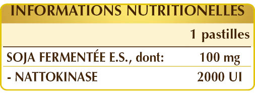 Complément alimentaire à base d’extrait de soja fermenté contenant l’enzyme nattokinase à action fibrinolytique. La nattokinase est isolée du natto, un aliment produit par la fermentation de soja non génétiquement modifié avec une souche sélectionnée de Bacillus subtilis var. natto.
