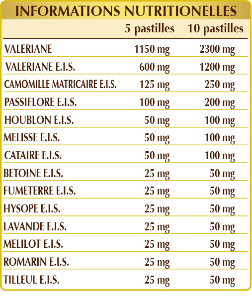 Valériane (Valeriana officinalis) racines poudre et E.I.S., camomille matricaire (Matricaria chamomilla) têtes des fleurs E.I.S., passiflore (Passiflora incarnata) herbe avec des fleurs E.I.S., cellulose microcristalline°, gomme arabique°, houblon (Humulus lupulus) cônes (fleurs femelles) E.I.S., mélisse (Melissa officinalis) feuilles E.I.S., cataire (Nepeta cataria) herbe avec des fleurs E.I.S., bétoine officinale (Stachys officinalis) herbe E.I.S., fumeterre officinale (Fumaria officinalis) herbe avec des fleurs E.I.S., hysope (Hyssopus officinalis) sommités E.I.S., lavande (Lavandula officinalis) fleurs E.I.S., mélilot jaune (Melilotus officinalis) herbe avec des fleurs E.I.S., romarin (Rosmarinus officinalis) feuilles E.I.S., tilleul (Tilia platyphyllos) fleurs E.I.S., dioxyde de silicium°°, stéarate de magnésium d'origine végétale.°°