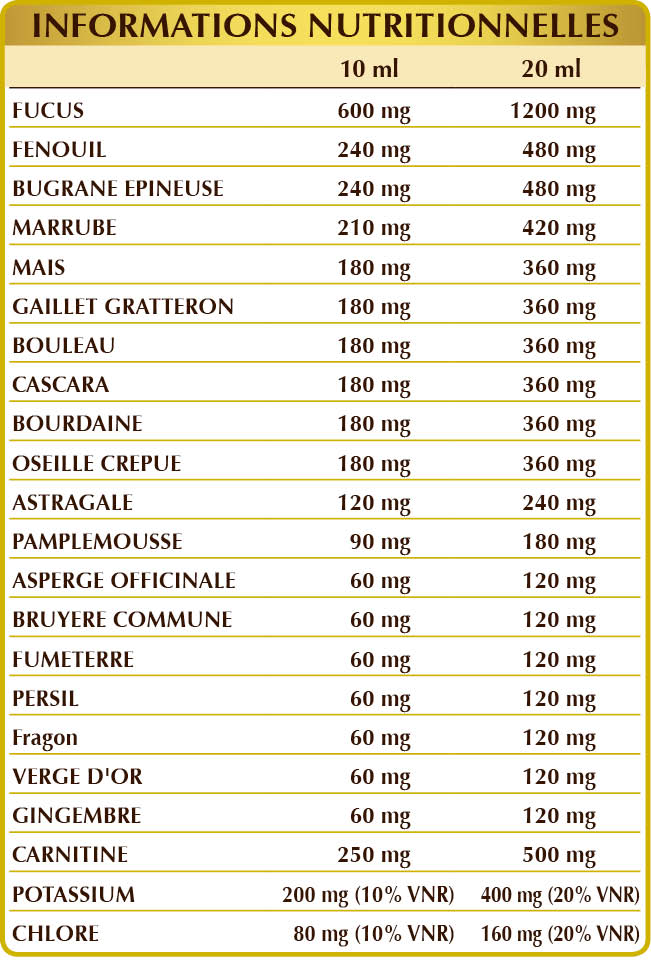 Glycérine végétale bidistillée, eau pure, fucus ou chêne marin (Fucus vesiculosus) tige (algue) E.I.L., citrate de potassium, (L-)carnitine, fenouil (Foeniculum vulgare) E.I.L. fruits, bugrane épineuse (Ononis spinosa) racines E.I.L., marrube blanc (Marrubium vulgare) ) herbe avec des fleurs E.I.L., maïs ou blé d’Inde (Zea mays) stigmates E.I.L., gaillet gratteron (Galium aparine) herbe avec des fleurs E.I.L., bouleau blanc (Betula alba ou pubescens) feuilles E.I.L., écorce de cascara (Rhamnus purshiana) E.I.L., bourdaine (Rhamnus frangula) écorce E.I.L., racines de romarin (Rumex crispus) E.I.L., chlorure de potassium E.I.L., racines de talus (Astragalus membranaceus) E.I.L., graines de pamplemousse (Citrus paradisi) E.I.L., racines d’asperges (Asparagus officinalis) E.I.L., bruyère commune (Calluna vulgaris) herbe avec des fleurs E.I.L., fumaria (Fumaria officinalis) herbe avec des fleurs E.I.L., persil (Petroselinum crispum) racines E.I.L., fragon ou fragon épineux (Ruscus aculeatus) (Ruscus aculeatus) racines E.I.L., verge d’or (Solidago virga-aurea) herbe avece des fleurs E.I.L., gingembre (Zingiber officinalis) rhizomes E.I.L.