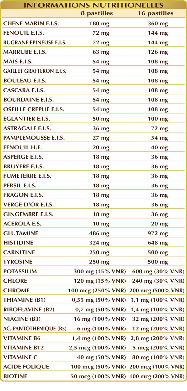 (L-)glutamine, citrate de potassium, cellulose microcristalline°, gomme arabique°, (L-)histidine, chlorure de potassium, (L-)carnitine, (L-)tyrosine (de fermentation), chêne marin (Fucus vesiculosus) thalle (algue) E.I.S., dioxyde de silicium°°, fenouil (Foeniculum vulgare) fruits E.I.S., bugrane épineuse (Ononis spinosa) racines E.I.S., marrube blanc (Marrubium vulgare) herbe avec des fleurs E.I.S., gaillet gratteron (Galium aparine) herbe avec des fleurs E.I.S., bouleau blanc (Betula alba ou pubescens) feuilles E.I.S., cascara (Rhamnus purshiana) écorces E.I.S., bourdaine (Rhamnus frangula) écorces E.I.S., maïs ou blé de Turquie (Zea mays) stigmates E.I.S., oseille crépue (Rumex crispus) racines E.I.S., églantier (Rosa canina) fruits E.I.S. (titré à 70% de vitamine C), astragale (Astragalus membranaceus) racines E.I.S., pamplemousse (Citrus paradisi) graines E.I.S., fenouil (Foeniculum vulgare) fruits H.E., asperge officinale (Asparagus officinalis) racines E.I.S., bruyère commune (Calluna vulgaris) herbe avec des fleurs E.I.S., fumeterre officinale (Fumaria officinalis) herbe avec des fleurs E.I.S., persil (Petroselinum crispum) racines E.I.S., fragon ou fragon épineux (Ruscus aculeatus) racines E.I.S., verge d'or (Solidago virga-aurea) herbe avec des fleurs E.I.S., gingembre (Zingiber officinalis) rhizomes E.I.S., vitamine B3 (nicotinamide), stéarate de magnésium d'origine végétale°°, acérola (Malpighia glabra) fruits E.S. (titré à 50% de vitamine C), vitamine B5 (pantothénate de calcium), vitamine B6 activée (pyridoxal-5-phosphate), vitamine B2 activée (riboflavine 5-phosphate de sodium), chrome picolinate, vitamine B1 (chlorhydrate de thiamine), acide folique activé (L-méthylfolate de calcium), biotine, vitamine B12 activée (5-désoxyadénosylcobalamine, méthylcobalamine). °Agent de charge °°Agent antiagglomérant