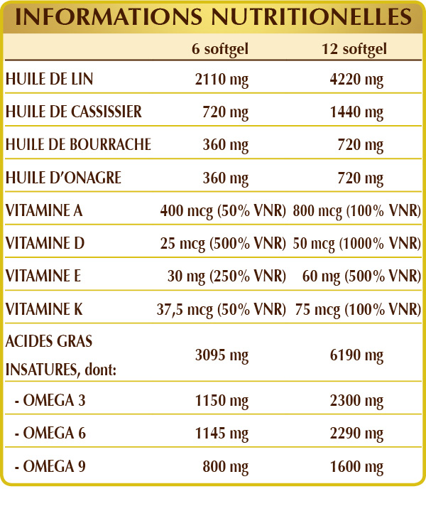 Huile de graines de lin (Linum usitatissimum), huile de graines de cassis (Ribes nigrum), huile de graines de bourrache (Borago officinalis), huile de graines d'onagre (Oenothera biennis), vitamine E d'origine naturelle (D-α-tocophérol), vitamine A (palmitate de rétinyle), vitamine K1 (phylloquinone), vitamine D3 (cholécalciférol); excipients (softgel): gélatine et glycérine alimentaires.