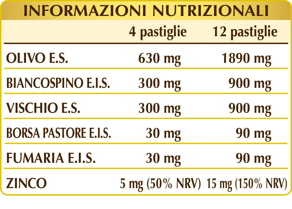 Olivier (Olea europaea) feuilles E.S. (normalisé à 40% de oleuropéine), aubépine (Crataegus oxyacantha) fleurs et feuilles E.I.S., gui (Viscum album) feuilles E.S., gomme arabique°, cellulose microcristalline°, gluconate de zinc, bourse à pasteur (Capsella bursa-pastoris) herbe E.I.S., fumeterre (Fumaria officinalis) herbe avec des fleurs E.I.S., dioxyde de silicium°°, stéarate de magnésium d'origine végétale°°. °Agent de charge.