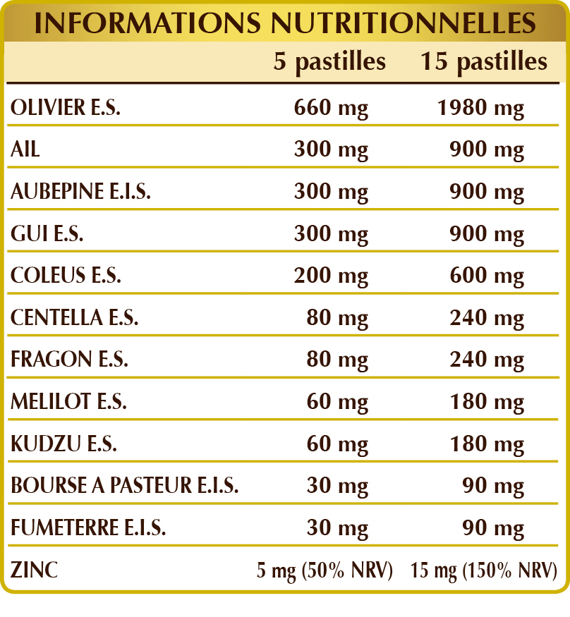 Olivier (Olea europaea) feuilles E.S. (titré à 40% d’oleuropéine), poudre de bulbes d’ail (Allium sativum) séchés à basse température, aubépine (Crataegus oxyacantha) fleurs et feuilles E.I.S., gui (Viscum album) feuilles E.S., coleus (Coleus forskohlii) racine E.S. (titré à 10% de forskohline), gomme arabique°, cellulose microcristalline°, centella asiatique (Centella asiatica) herbe E.S. (titré à 20% de dérivés triterpeniques), fragon ou fragon épineux (Ruscus aculeatus) racines E.S. (titré à 5% d'apigéniné), passiflore (mélilot incarnata) herbe avec des fleurs E.S. (titré à 20% de coumarines), kudzu (Pueraria lobata) racines E.S. (titré à 40% de flavonoïdes), gomme arabique, cellulose microcristalline, bourse à pasteur (Capsella bursa-pastoris) herbe E.S., fumeterre (Fumaria officinalis) herbe avec des fleurs E.S., dioxyde de silicium°°, stéarate de magnésium d'origine végétale°°. °Agent de charge °°Agent antiagglomérant