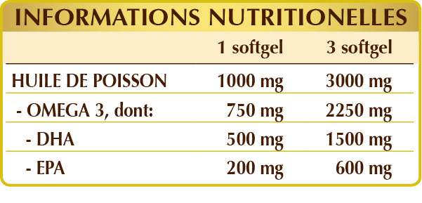 Huile de poisson (normalisé à 75% d’omega 3 totals, dont au moins 50% DHA et 20% EPA); excipients (softgel) : gélatine alimentaire et glycérine. Softgels de 1450 mg, dont 1000 mg de produit net et 450 mg d'excipients d'enveloppe.