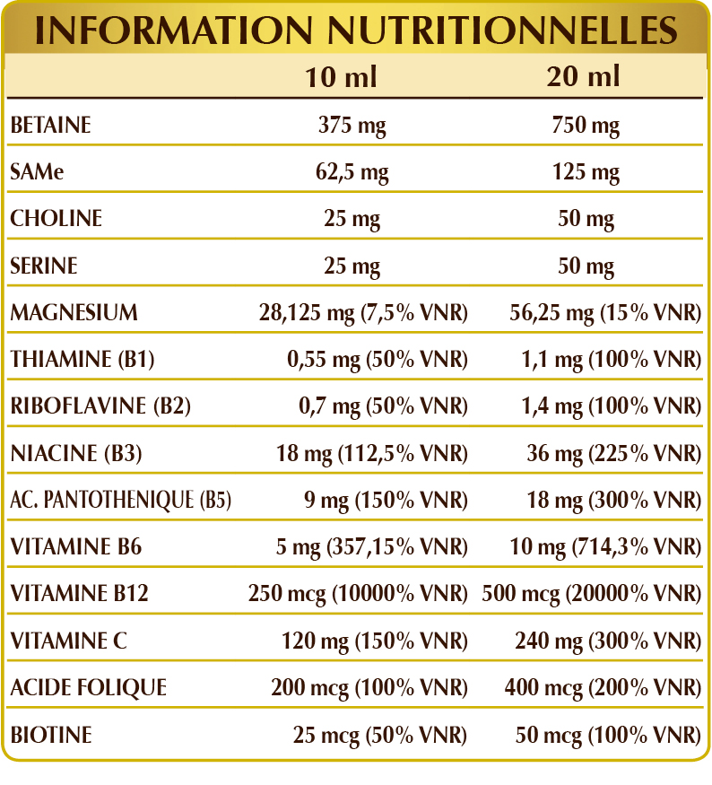 Glycérine végétale bidistillée, eau pure, bétaïne, glycéro-phosphate de magnésium, SAMe (S-adénosyl méthionine disulfate tosilate), vitamine C (acide ascorbique), choline tartrate, (L-)sérine, vitamine B3 (nicotinamide), vitamine B5 (pantothénate de calcium), vitamine B6 activée (pyridoxal-5-phosphate) ; édulcorants d’origine naturelle : glycosides de stéviol issus de la stévia, thaumatin ; vitamine B2 activée (riboflavine 5-phosphate de sodium), vitamine B1 (chlorhydrate de thiamine), acide folique activé (L-méthylfolate de calcium), biotine, vitamine B12 activée (5-désoxyadénosylcobalamine et méthylcobalamine).