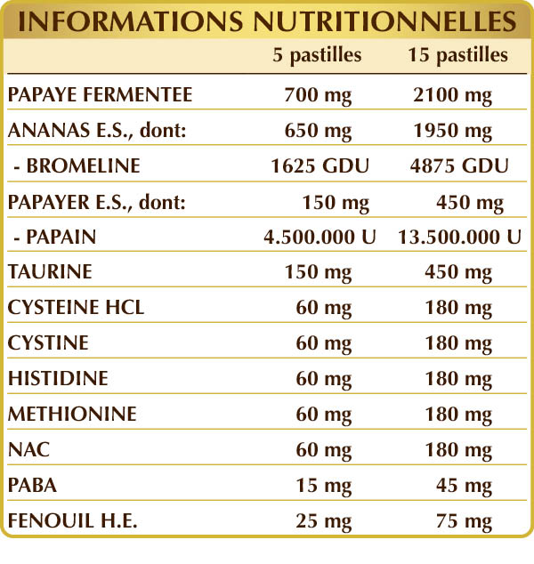 Papayer (Carica papaya) fruits fermentés poudre, ananas (Ananas comosus) tiges des fruits E.S. (broméline 2500 GDU/g), gomme arabique°, cellulose microcristalline°, papayer (Carica papaya) fruits E.S. (papaïne 30 000 U/mg), taurine, (L-)cystéine HCL ou chlorhydrate, (L-)cystine, (L-)histidine, (L-)méthionine, NAC (N-acétylcystéine), PABA (p- acide aminobenzoïque), dioxyde de silicium°°, fenouil (Foeniculum vulgare) fruits E.O., stéarate de magnésium d'origine végétale°°. °Agent de charge °°Agent antiagglomérant