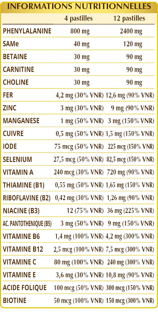 (L-)phénylalanine, cellulose microcristalline°, gomme arabique°, SAMe (méthionine S-adénosyl-méthionine tosylate disulfate), vitamine C (acide ascorbique), tartrate de choline, gluconate de fer, (L-)carnitine, bétaïne, dioxyde de silicium°°, gluconate de zinc, vitamine B3 (nicotinamide), stéarate de magnésium d'origine végétale°°, gluconate de manganèse, vitamine E d'origine naturelle (acétate de D-α tocophérol), gluconate de cuivre, vitamine B5 (pantothénate de calcium), vitamine B6 (pyridoxine), vitamine A (acétate de rétinyle), vitamine B1 (thiamine), vitamine B2 (riboflavine), acide folique, iodure de potassium, sélénite de sodium, biotine, vitamine B12 (cyanocobalamine).