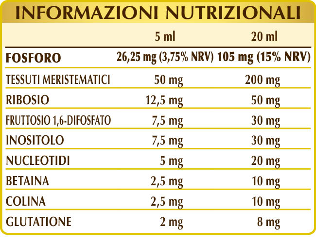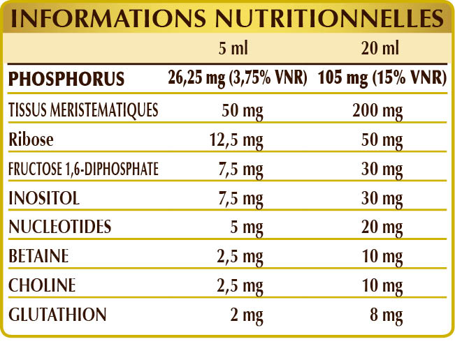 Glycérine végétale bi-distillée, eau pure, phosphate de sodium dibasique; correcteur d'acidité: acide phosphorique; macérat glycériné de tissus méristématiques frais : bouleau blanc (Betula alba, ou Betula pubescens, Betula verrucosa et Betula pendula bourgeons, prunellier (Prunus spinosa) acide bourgeons, romarin (Rosmarinus officinalis) jeunes pousses, tilleul argenté (Tilia tomentosa) bourgeons; ribose, fructose 1,6 diphosphate, inositol, citrate de bétaïne, tartrate de choline; mélange de nucléotides: AMP (adénosine monophosphate), CMP (cytidine monophosphate), GMP (guanosine monophosphate), UMP (uridine monophosphate); glutathion réduit ; édulcorant d'origine naturelle: thaumatine (E957). Édulcoré uniquement avec des édulcorants d'origine naturelle.