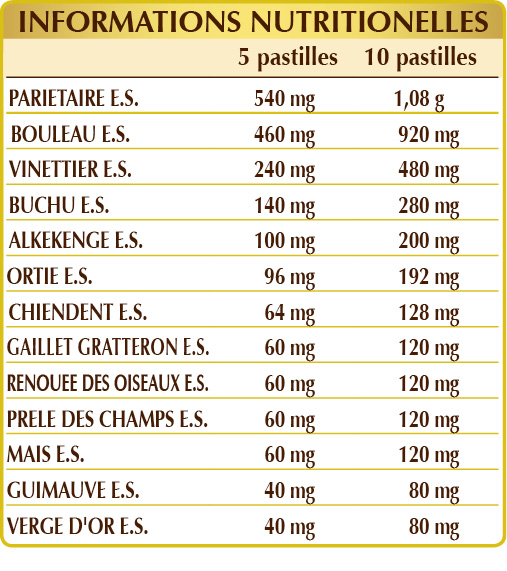 Pariétaire officinale (Parietaria officinalis) herbe E.S.I., bouleau blanc (Betula alba ou pubescens) feuilles E.S.I., cellulose microcristalline°, gomme arabique°, dioxyde de silicium°°, vinettier (Berberis vulgaris) écorces des racines E.S.I., buchu (Barosma betulina) feuilles E.S.I., alkékenge (Physalis alkekengi) fruits E.S.I., grande ortie (Urtica dioica) feuilles et racines E.S.I., chiendent (Agropyron repens) rhizomes E.S.I., gaillet gratteron (Galium aparine) herbe avec des fleurs E.S.I., renouée des oiseaux (Polygonum aviculare) herbe E.S.I., prêle des champs ou queue de cheval (Equisetum arvense) herbe E.S.I., maïs ou blé de Turquie (Zea mays) stigmates E.S.I., guimauve officinale (Althaea officinalis) racines E.S.I., verge d'or (Solidago virga-aurea) herbe avec des fleurs E.S.I., stéarate de magnésium d’origine végétale.°°