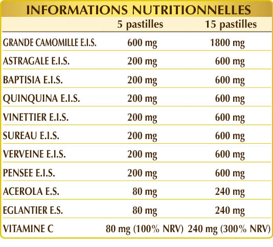 Grande Camomille ou Chrysanthème Matricaire (Tanacetum parthenium) herbe avec des fleurs E.I.S., astragale (Astragalus membranaceus) racines E.I.S., baptisia (Baptisia tinctoria) racines E.I.S., vinettier (Berberis vulgaris) écorces des racines E.I.S., sureau noir (Sambucus nigra) fleurs E.I.S., verveine (Verbena officinalis) herbe avec des fleurs E.I.S., pensée (Viola tricolor) herbe avec des fleurs E.I.S., cellulose microcristalline°, gomme arabique°, acérola (Malpighia glabra) fleurs E.S. (titré à 50% vitamine C), églantier (Rosa canina) fruits E.S. (titré à 50% antocyanosides), dioxyde de silicium°°, stéarate de magnésium d'origine végétale°°. °Agent de charge °°Agent antiagglomérant