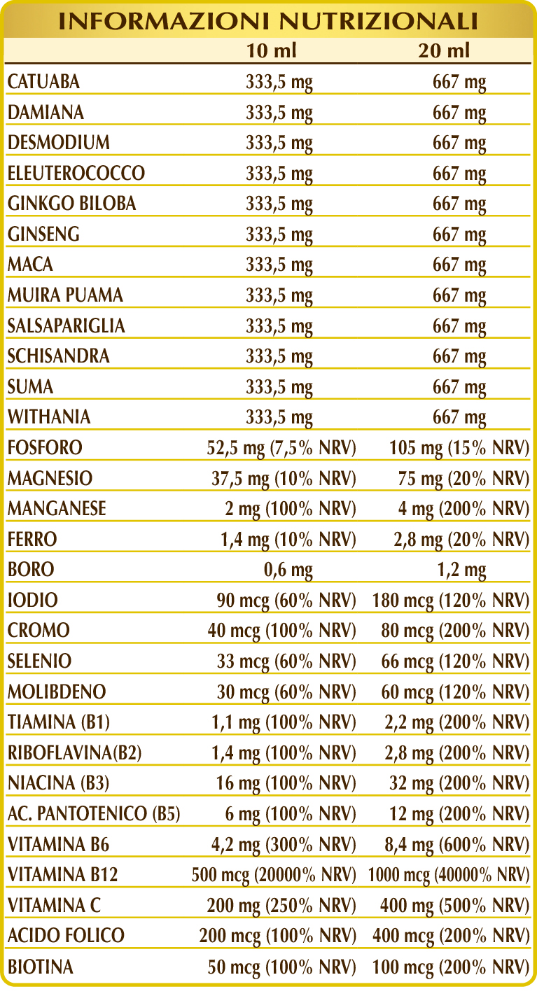 Complément alimentaire à base de plantes, de sels minéraux et de vitamines. Le ginseng, la maca, le suma et la withania, avec l'éleutherocco et le schisandra, exercent une action tonique-adaptogène tandis qu'avec le catauba, la damiana et le muira-puama, ils aident à lutter contre la fatigue physique et mentale. Le fer, le magnésium et les vitamines B2, B3, B5, B6, B12 et C contribuent à réduire la fatigue et l’épuisement et, avec le phosphore, l'iode, le manganèse, la vitamine B1 et la biotine, favorisent le métabolisme énergétique. La vitamine B6, de plus, favorise la régulation de l'activité hormonale. La maca exerce une action de soutien métabolique, le ginseng et le suma favorisent le métabolisme des glucides, et le chrome contribue au maintien des niveaux normaux de glucose dans le sang. Le ginseng et le suma, le muira-puama et le schisandra ont également une fonction antioxydante, et avec le manganèse, le sélénium et les vitamines B2 et C, ils contribuent à la protection des cellules contre le stress oxydatif.